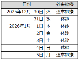 2025年12月30日から2026年1月5日にかけての年末年始期間中の外来休診は以下のとおりになります。