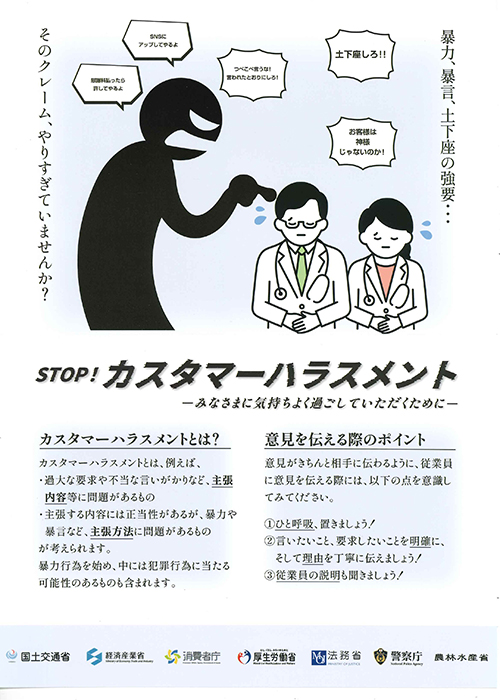 カスタマーハラスメントは「ご利用者様からの暴言・暴力・不当要求など著しい迷惑行為」と定義されています。